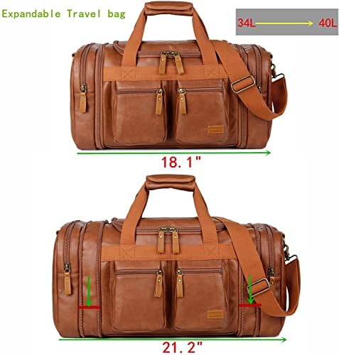 This travel bag is perfect for 2~4 days travel to use. This travel bag can also be used as a hospital bag, sports bag, shopping bag, beach bag, overnighter or weekender bag. Can serve as hand luggage for most airlines. Expandable capacity: From 34L to 40LVegan leather-like genuine leather accents But Don’t Hurts animalsShoe compartment: Two large side pockets can store your shoes (but the height is 11 inches)