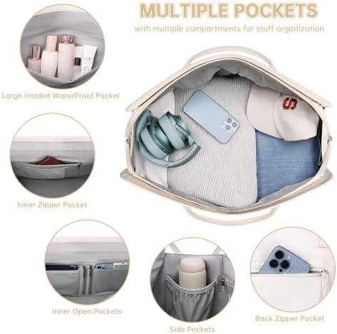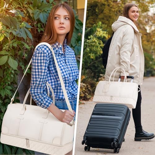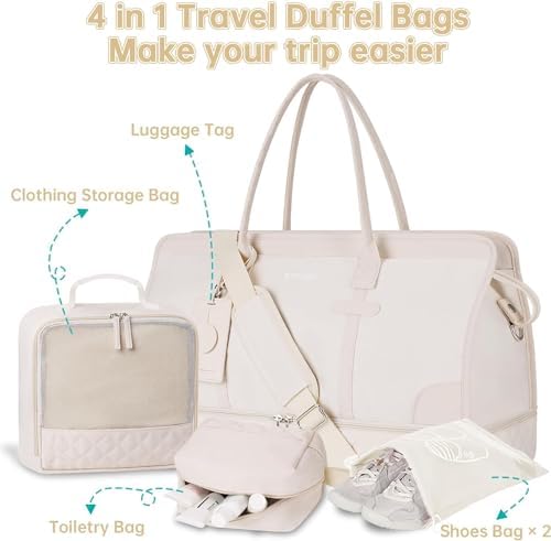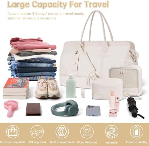 Large travel bag for women: the travel bag with multiple pockets and compartments for organising things. Spacious space can fit essentials in 3-5 days of travel, easy to fit in your clothes, toiletries, shoes, laptop, iPad and other items. In the back of the duffel bag there is a pocket for easy access to your smartphone, IDs or passport.