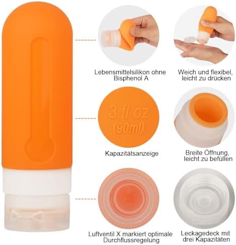 Bitte füllen Sie die Reiseflasche nicht vollständig aus. Es wird empfohlen, 3/4 der Kapazität zu füllen, um ein Auslaufen der Silikonflasche zu verhindern, wenn sie von außen angezogen wird. Fügen Sie keine sauren, ätzenden oder brennbaren Substanzen hinzu.