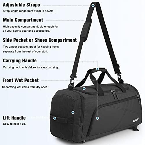 【With wet pocket and shoe cabinet】: There is a wet pocket on the front of the sports bag, which can separate wet towels or clothes from dry towels. The shoe compartment with ventilation holes allows you to store your shoes without messing up your clean stuff.
