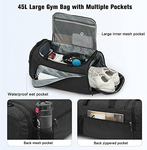 【MULTIPLE COMPARTMENTS】: The sports bag has a large main compartment (with a mesh pocket inside), a side pocket (can store shower gel, headphones, change), a water bottle pocket, a shoe layer and a wet pocket.