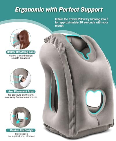 ✈【Versatile and thoughtful】: The hollow design in the middle of the inflatable neck pillow adapts to the curve of the human abdomen, allowing you to breathe easier while sleeping. The cutouts on both sides allow you to comfortably hold the planer cushion and relax your arms. You can also listen to music and watch videos while using an air cushion.