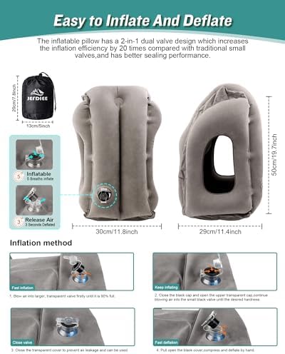 ✈【Easy to inflate and deflate】: The aircraft cushion has a 2-in-1 double valve design, which increases the inflation efficiency by 20 times compared to conventional small valves and can be filled in 5 seconds. And has better sealing performance. It can be inflated and deflated by hand with just a few breaths to deflate in just 3-5 seconds.
