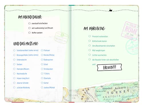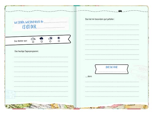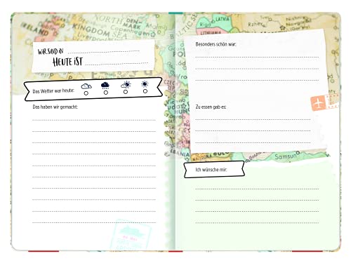 Das Reise-Tagebuch überzeugt in moderner Landkarten-Optik, mit Checklisten zur Reisevorbereitung und viel Platz zum Einkleben von Erinnerungsstücken. Vorformulierte Fragen erleichtern dabei das Eintragen.