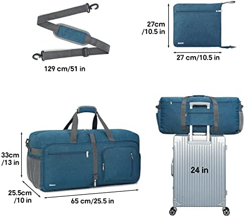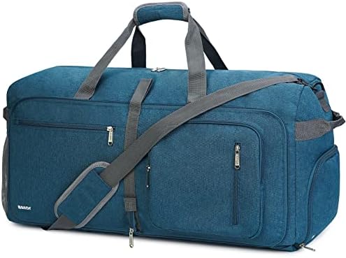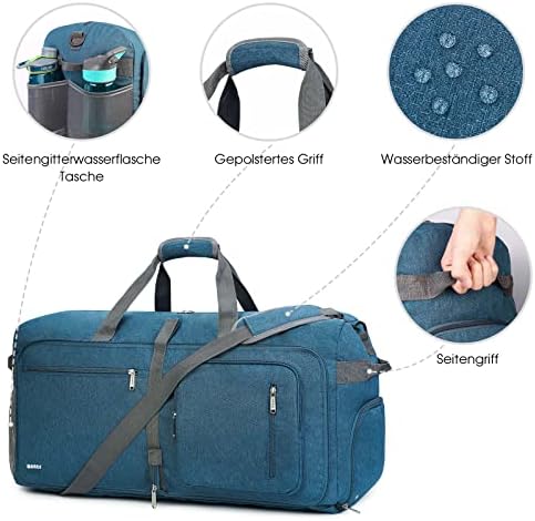 LARGE CAPACITY AND FOLDABLE: The WANDF weekender bag measures 65 x 25.5 x 33 cm and meets most requirements for business travel. The spacious 65 litre room easily fits for 3-5 days with the most important things of daily needs. Folded size: 29 x 26.7 x 7.6 cm, which can be used as a just-in-case bag in your suitcase.